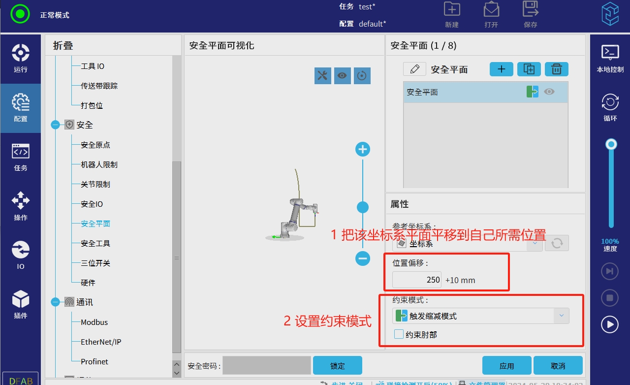 注意:位置偏移后面的參數 “ +10mm ” 的意思是機械臂工具中心點靠近安全平面10mm處就開始觸發所設置的模式了。