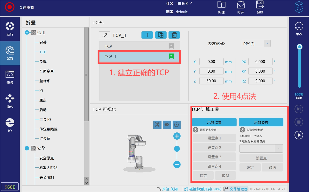 1. 我們在創建安全工具之前首先要建立好正確的TCP工具中心點,在配置-----TCP中創建新的tcp。如下圖: